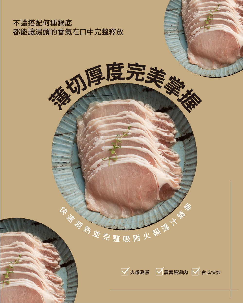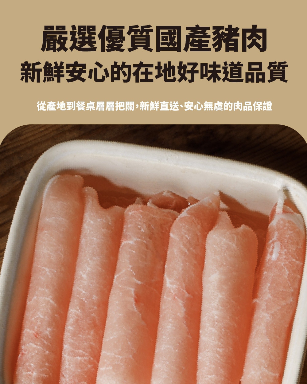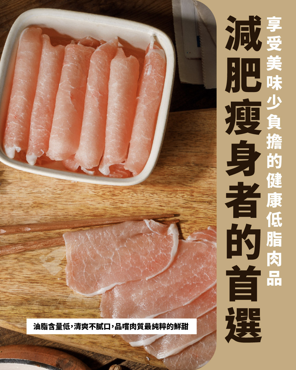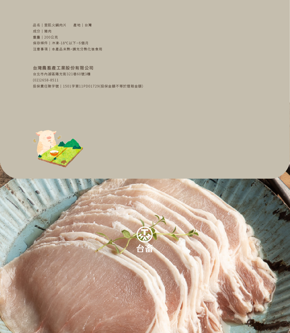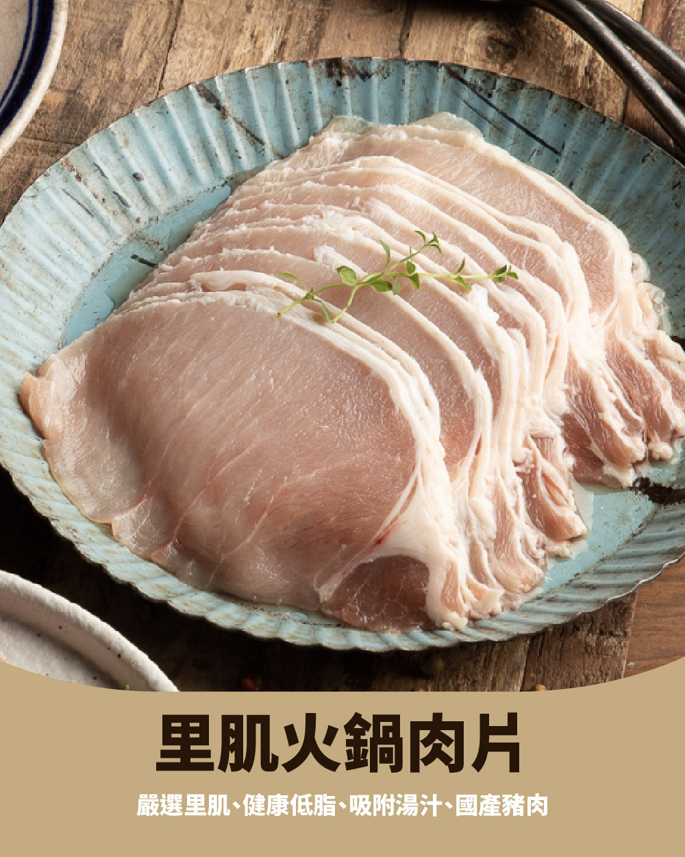 里肌肉是豬背脊偏後腿部位的瘦肉,是豬體最大最長的肌肉,肉質結實,油脂分布較少,鮮嫩富咬勁,經切片成0.2公分厚度,適合火鍋涮煮、壽喜燒或快炒等短時間的快速料理。