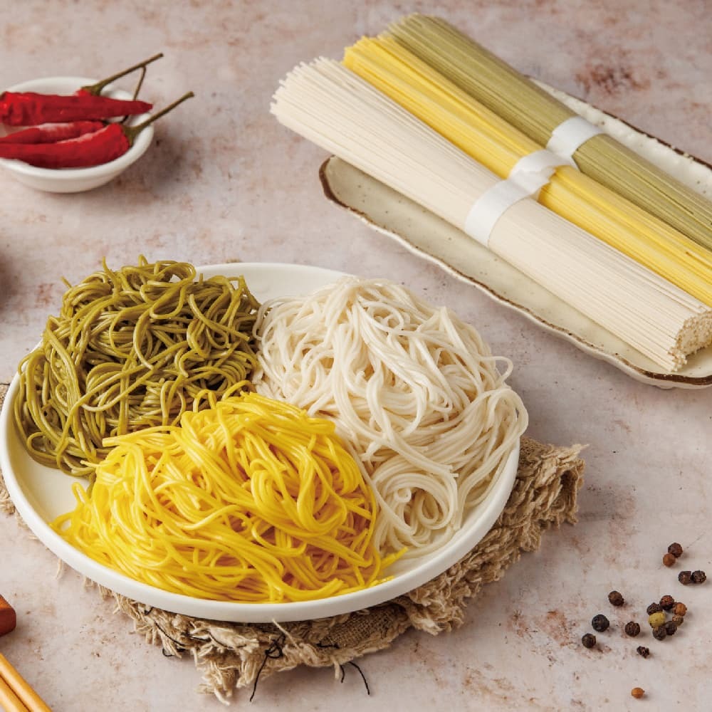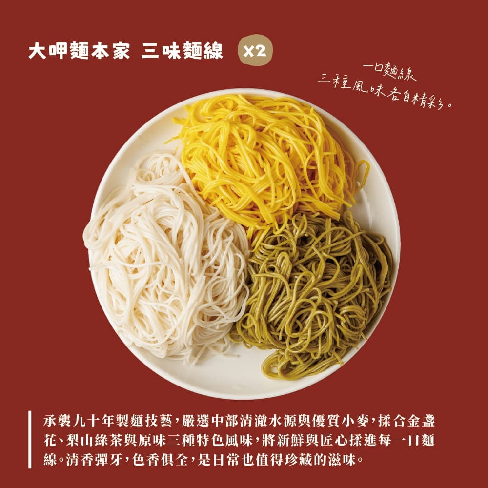 承襲九十年製麵技藝,嚴選中部清澈水源與優質小麥,揉合金盞花、梨山綠茶與原味三種特色風味,將新鮮與匠心揉進每一口麵線。清香彈牙,色香俱全,是日常也值得珍藏的滋味。"