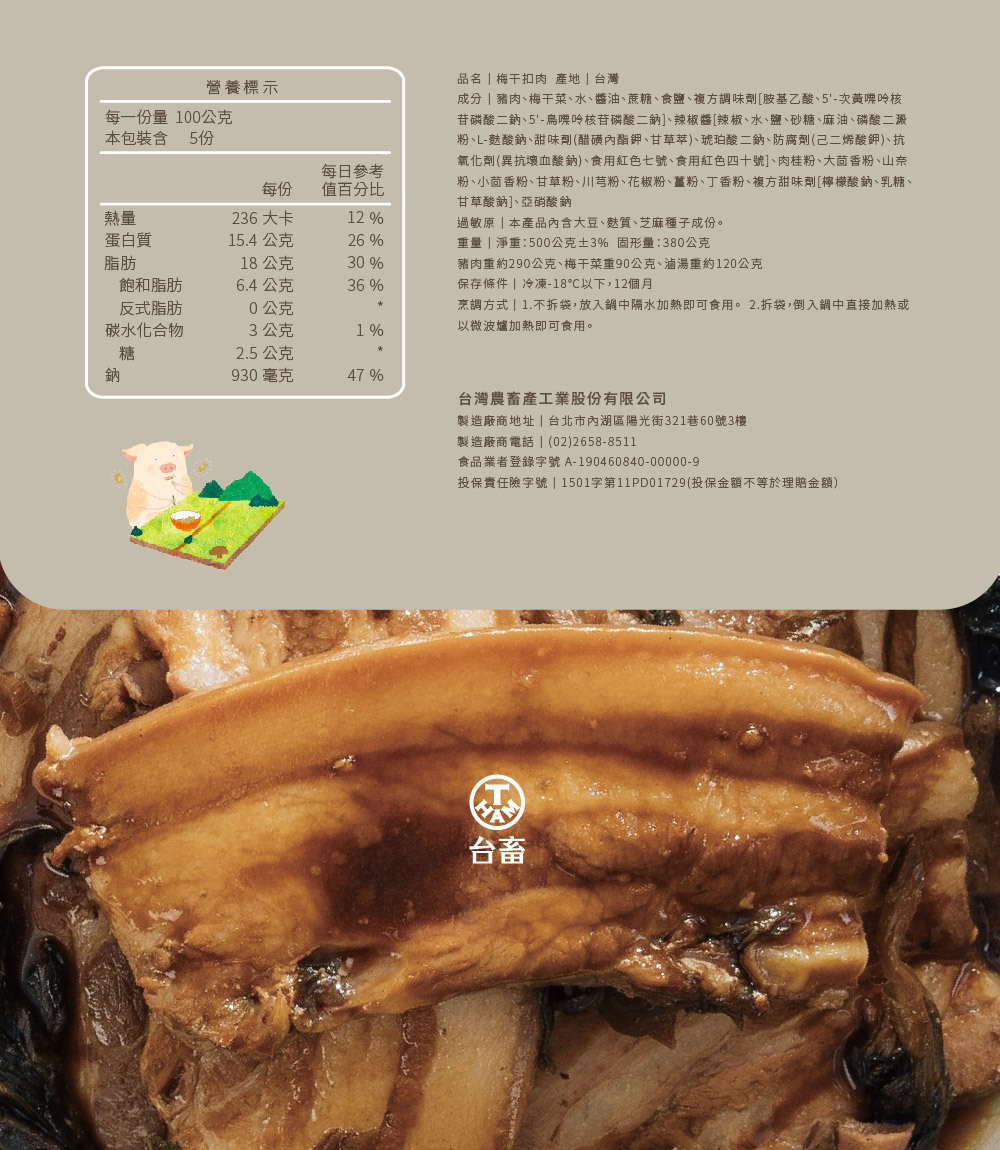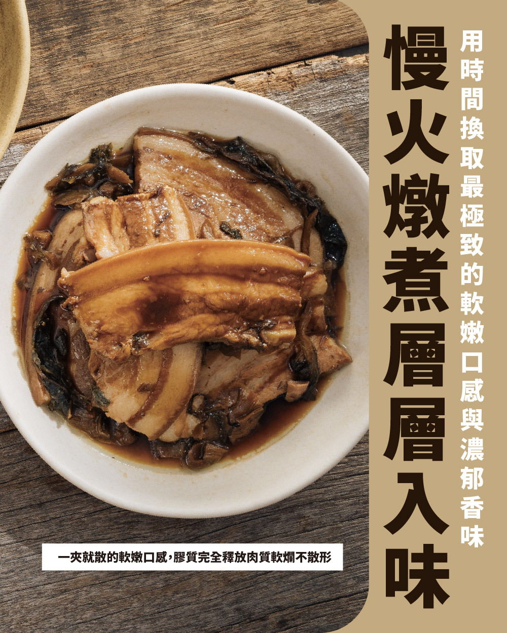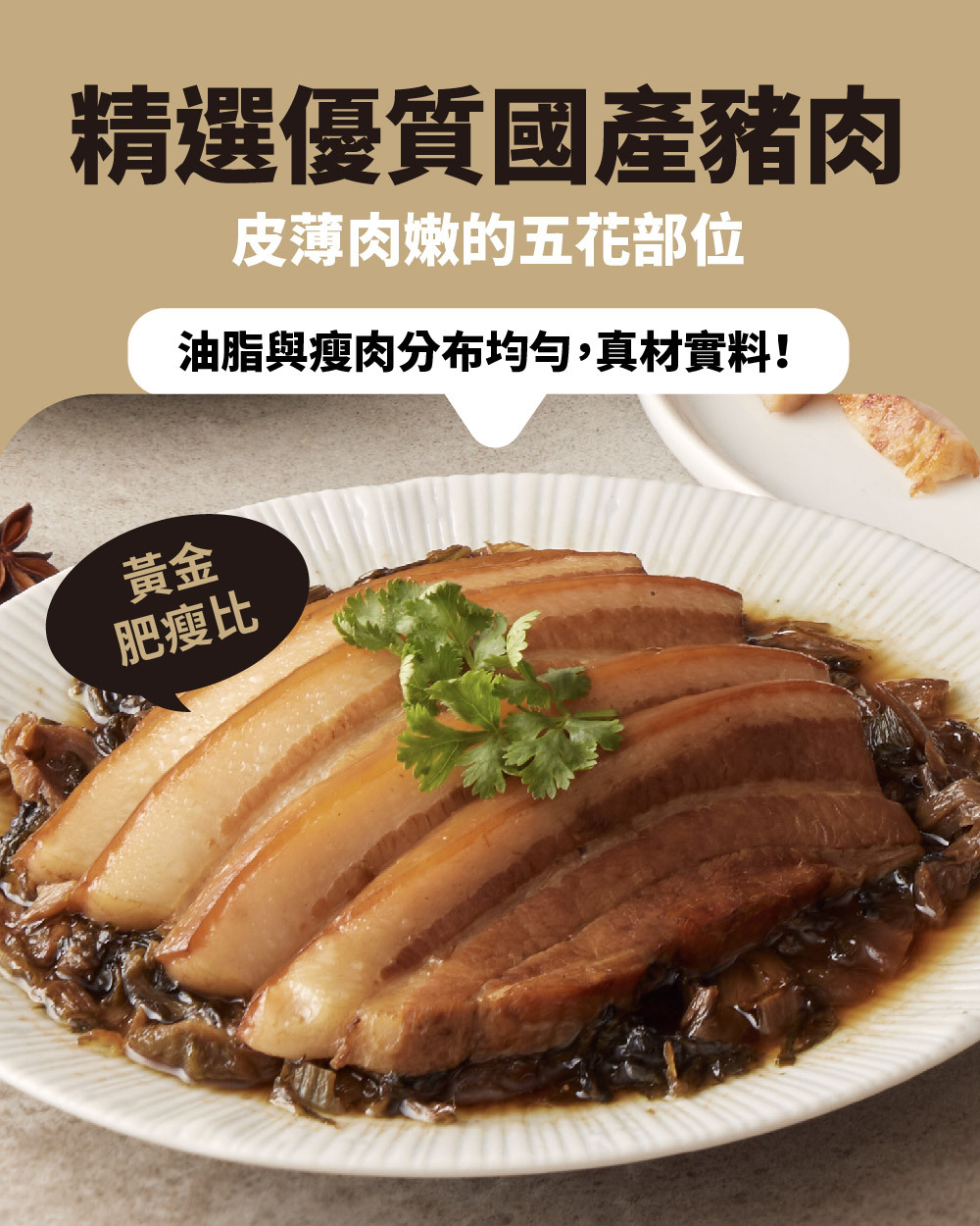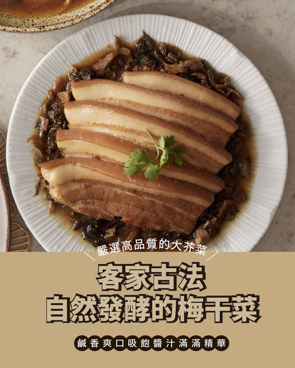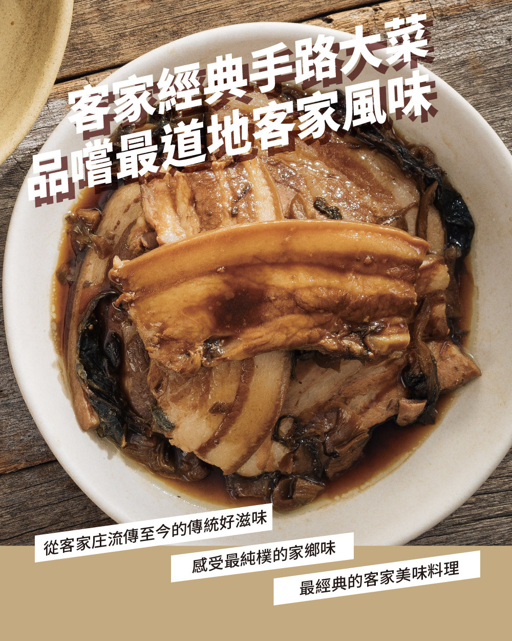 台灣客家料理的經典美食之一,精選皮薄肉嫩之五花肉,遵循客家傳統製成。以慢火燉煮,製程需要較長時間,才能達到香醇肉嫩的完美口感,梅干菜的甘脆與五花肉的油香融為一體,是道地的家鄉風味,讓人垂涎三尺的魅力佳餚。現在不用大費周章準備,台畜澎派的規格化產品,享受經典大菜不用等。