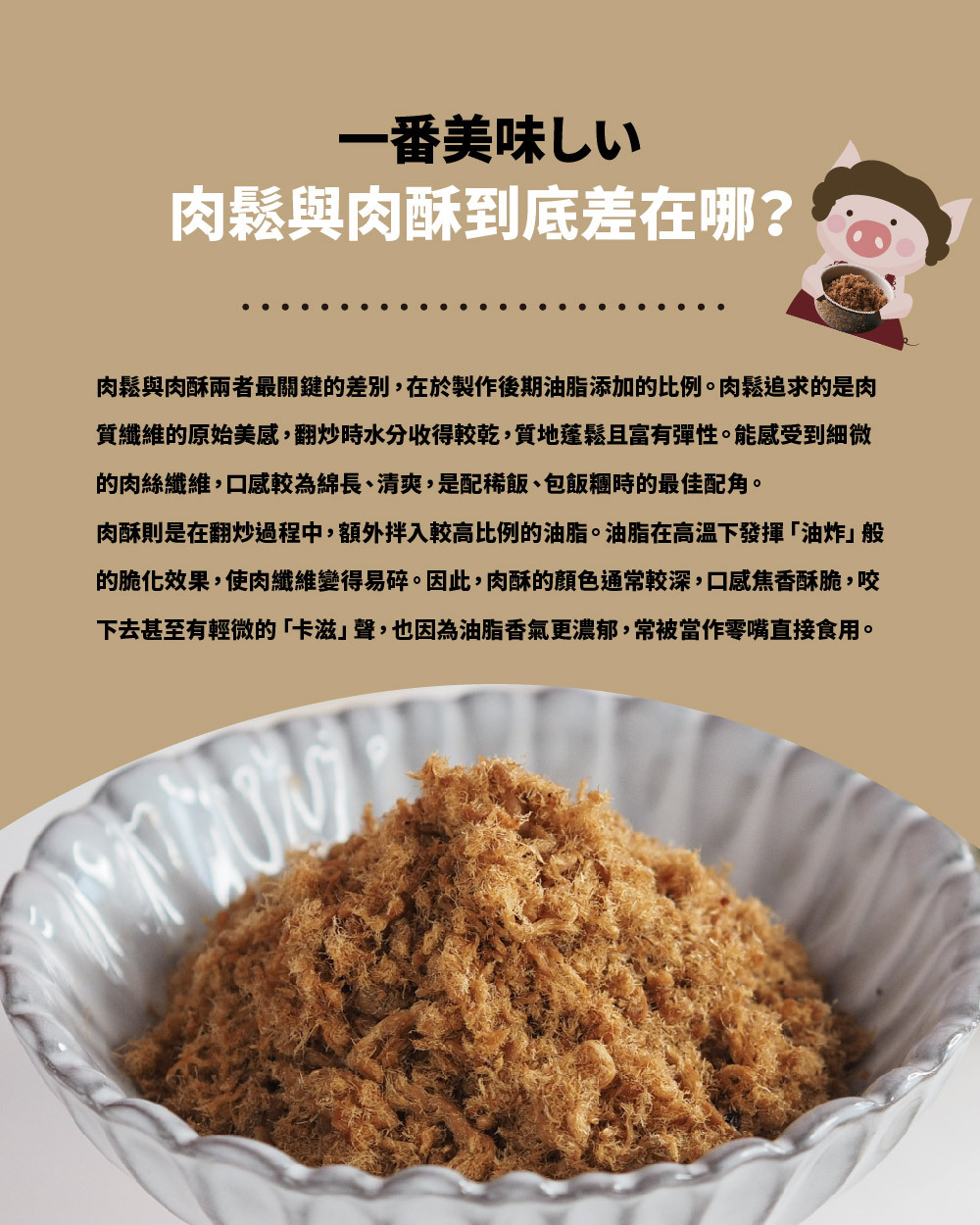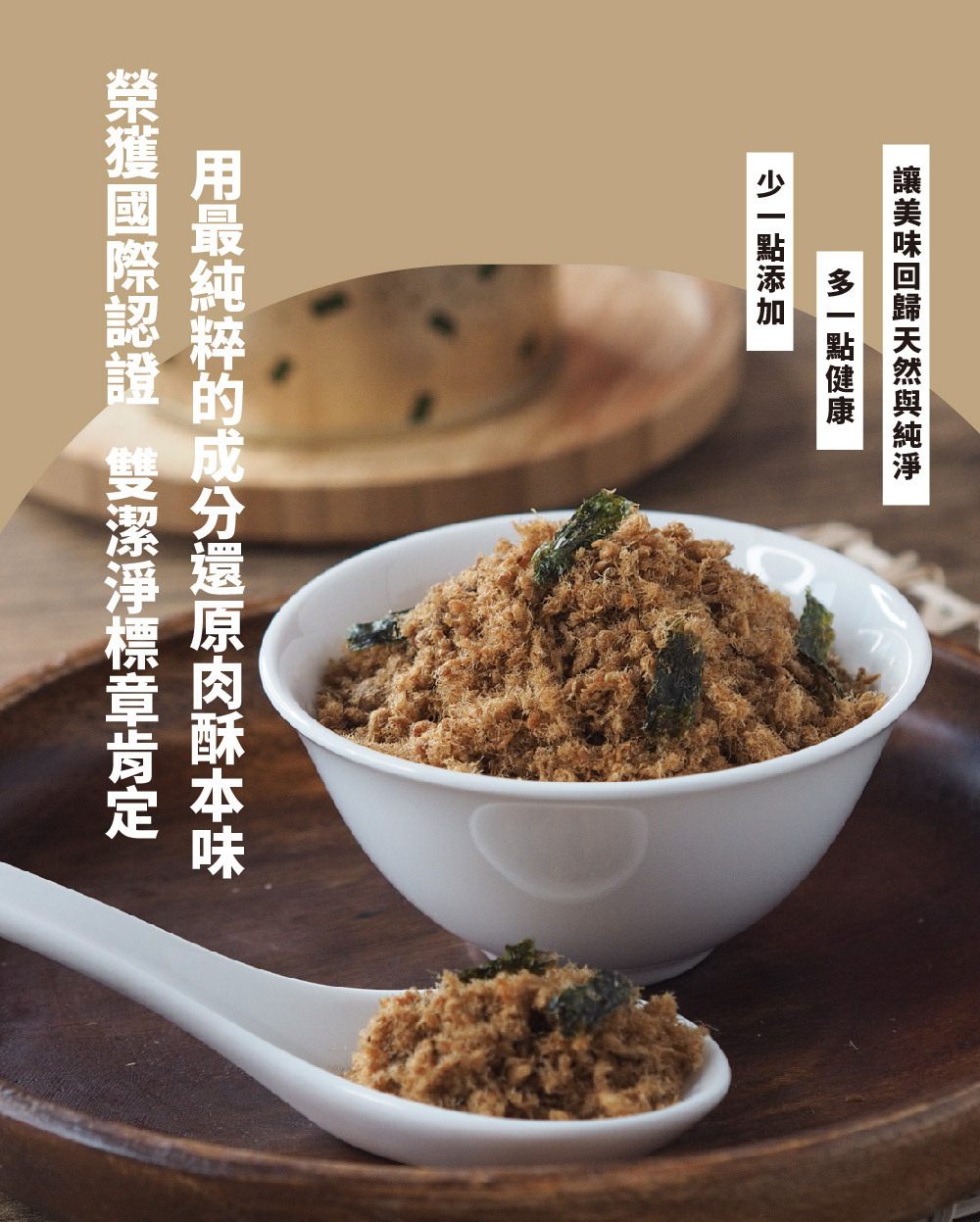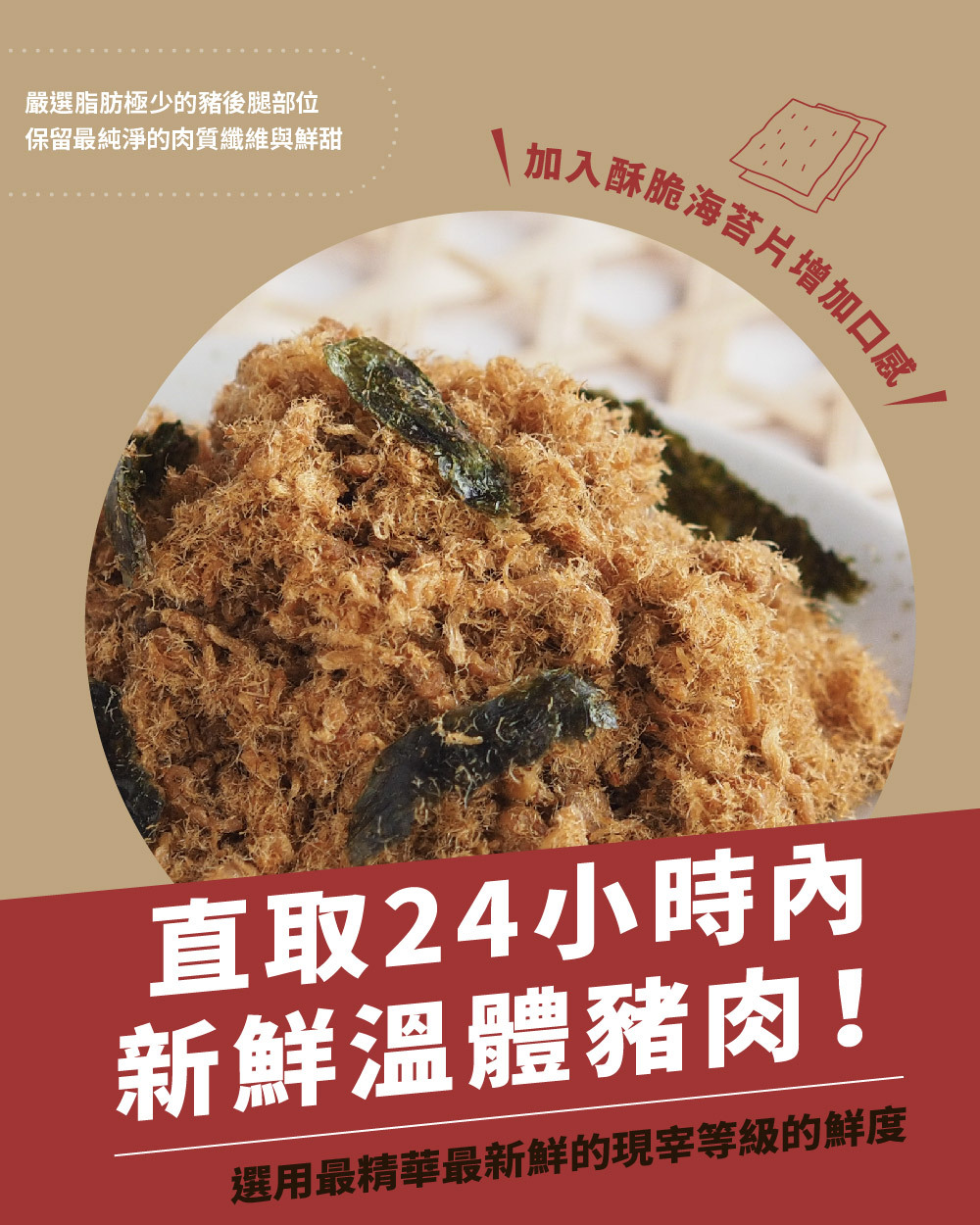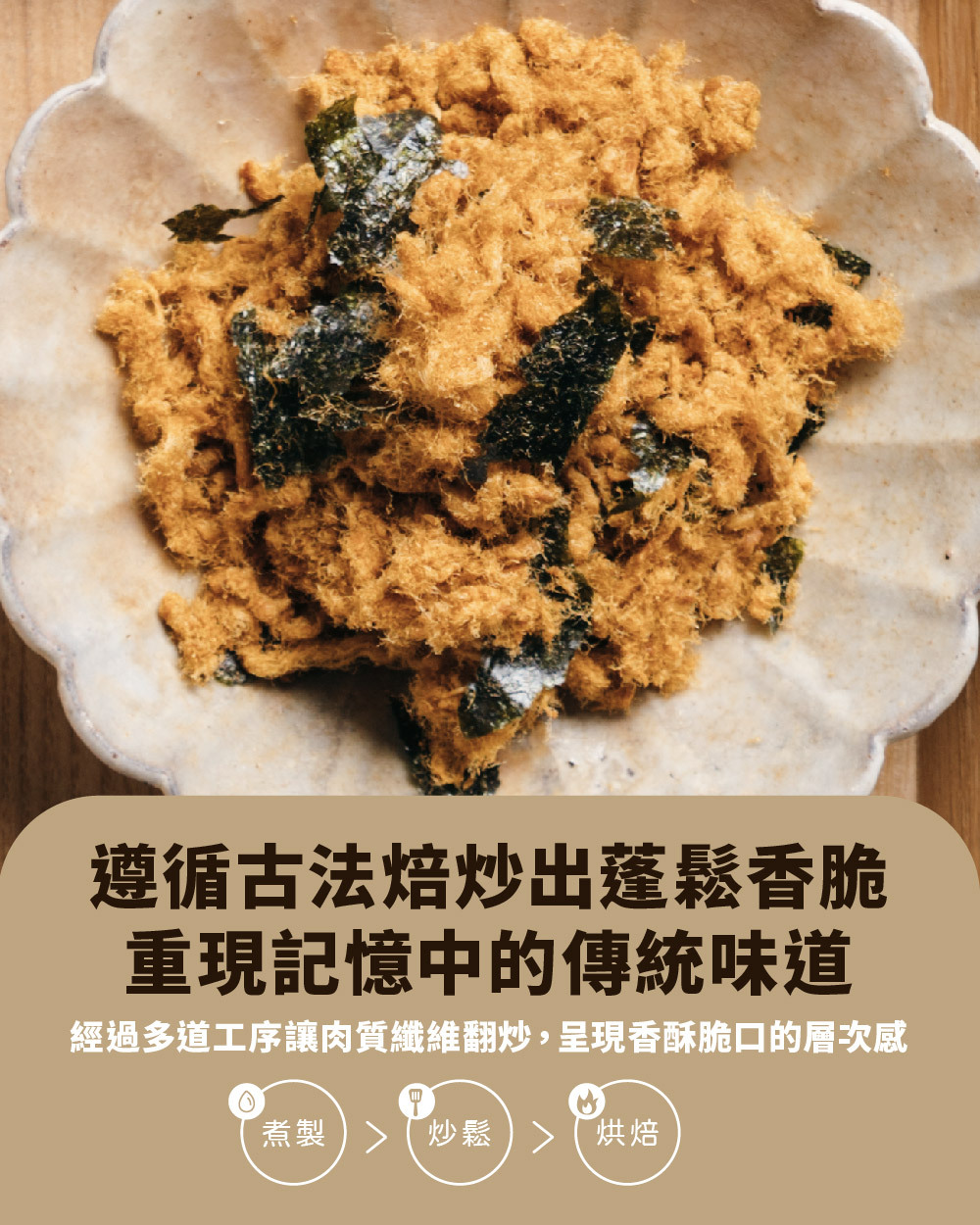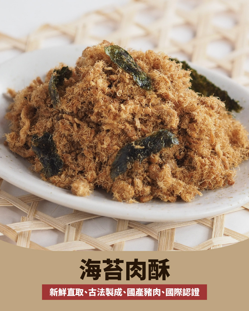 不添加味精、豆粉、人工添加物,保有肉絲完整纖維。特別採用屠宰24小時內的豬溫體肉,採集豬後腿中脂肪含量少的特定部位,做成後腿肉絲,先進加工技術與傳統焙炒方法兩者的運用下,使肉絲纖維呈現蓬鬆感及金黃色澤,添加天然無污染的海苔片,為產品增添海洋鮮味。酥脆肉絲纖維與香脆海苔片的雙重口感,絕對讓您愛不釋手。台畜原味肉酥為CAS認證的優良肉品,為潔淨標示最佳代表,讓您吃得安心、選購放心,是台灣特色伴手禮的最佳選擇。