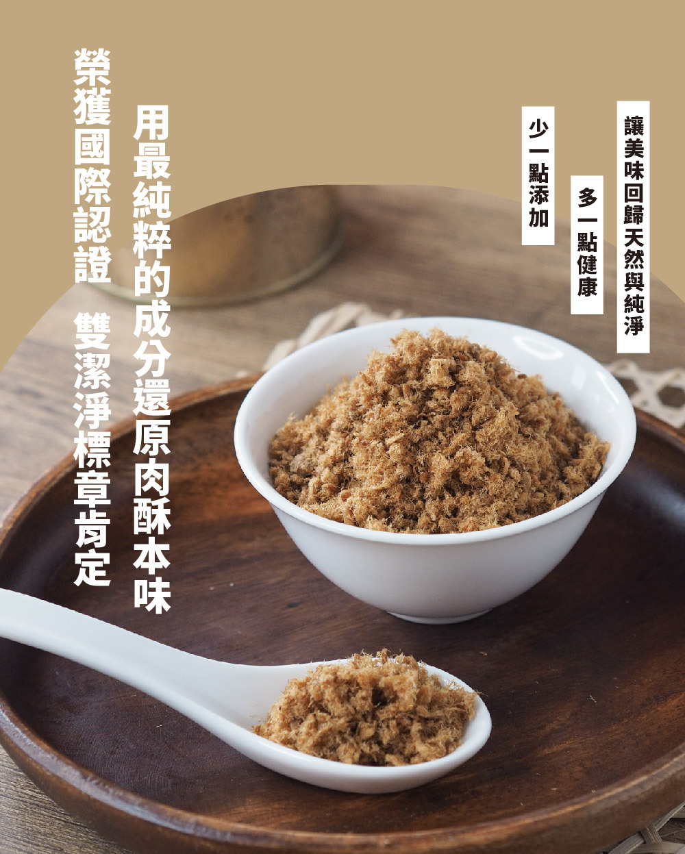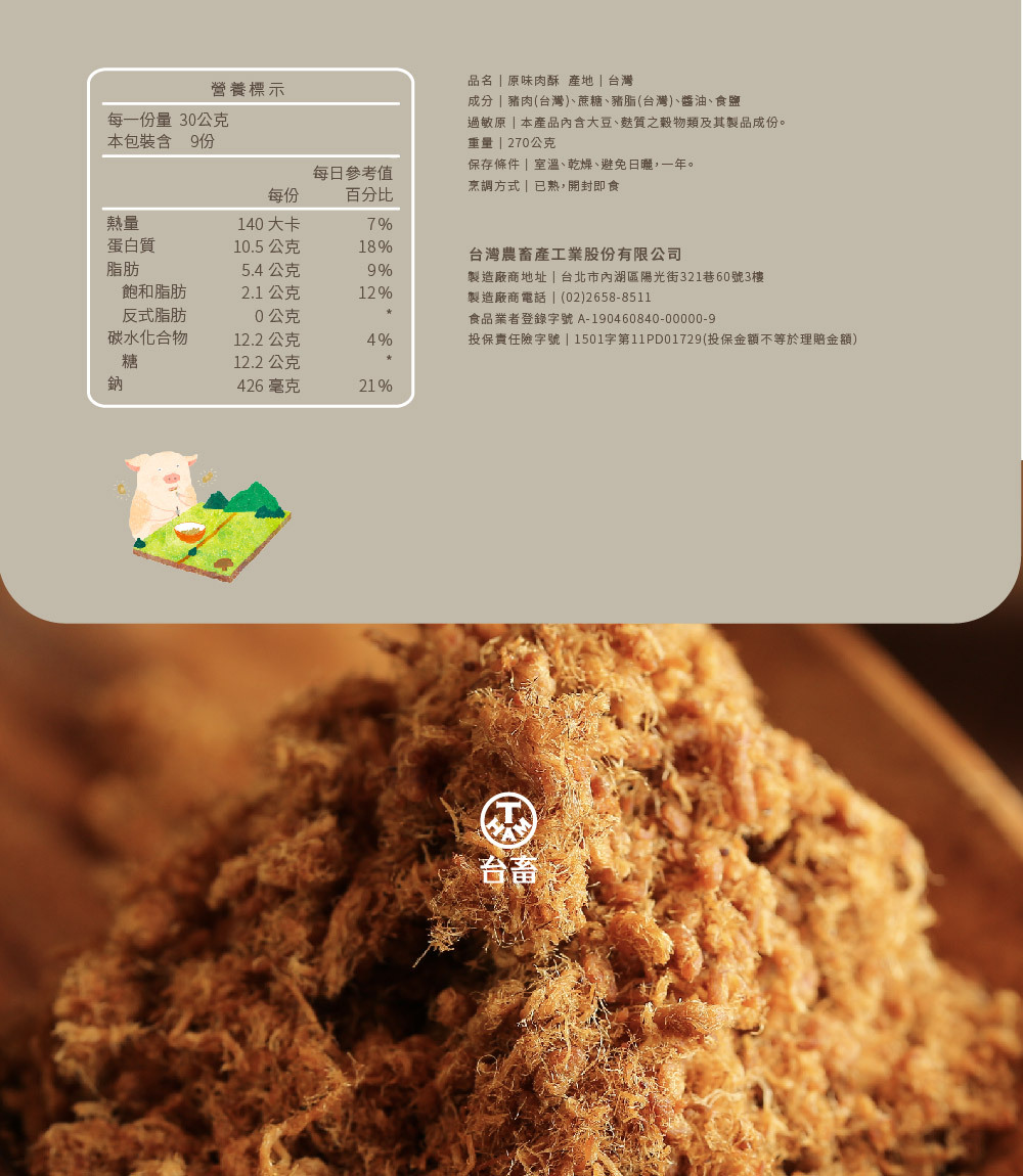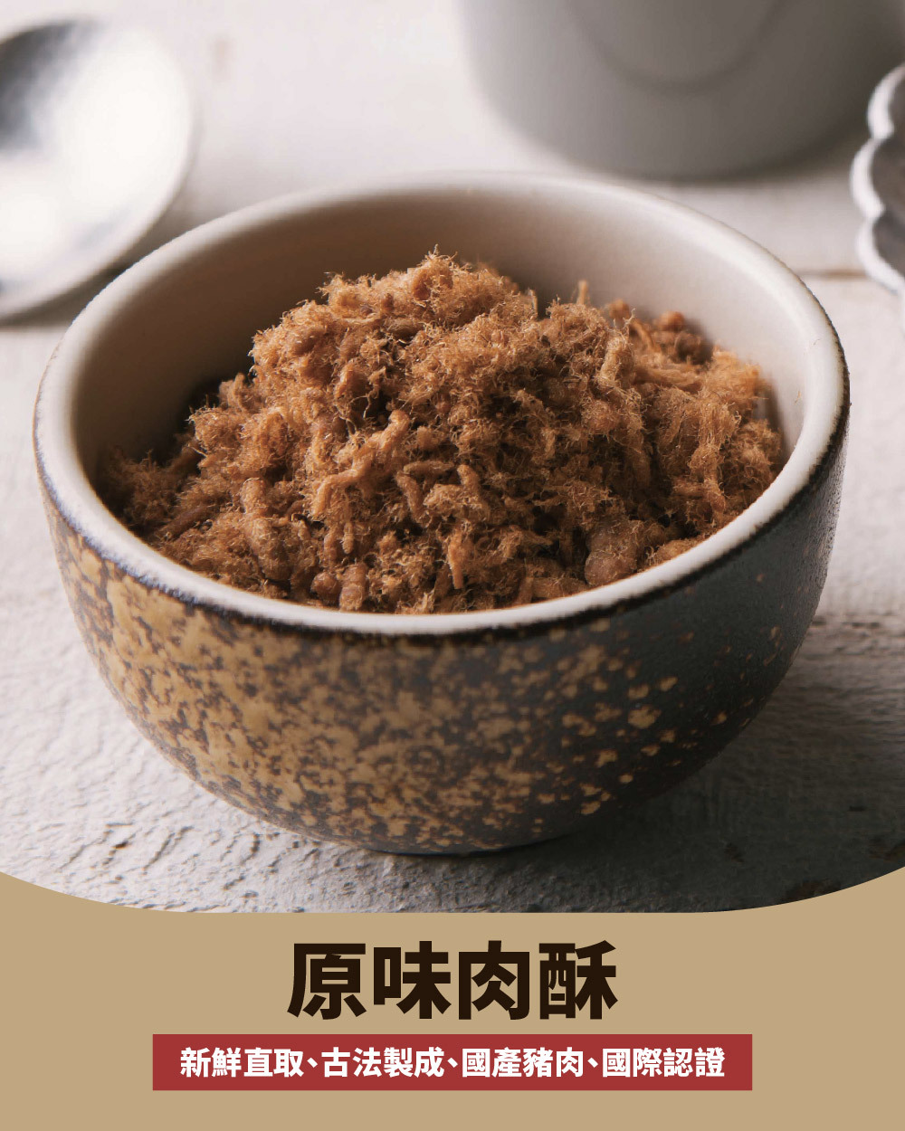 不添加味精、豆粉、人工添加物,保有肉絲完整纖維。特別採用屠宰24小時內的豬溫體肉,採集豬後腿中脂肪含量少的特定部位,做成後腿肉絲,先進加工技術與傳統焙炒方法兩者的運用下,使肉絲纖維呈現金黃色,口感蓬鬆酥脆,獨家特殊風味,絕對讓您愛不釋手。台畜原味肉酥為CAS認證的優良肉品,為潔淨標示最佳代表,讓您吃得安心、選購放心,是台灣特色伴手禮的最佳選擇。