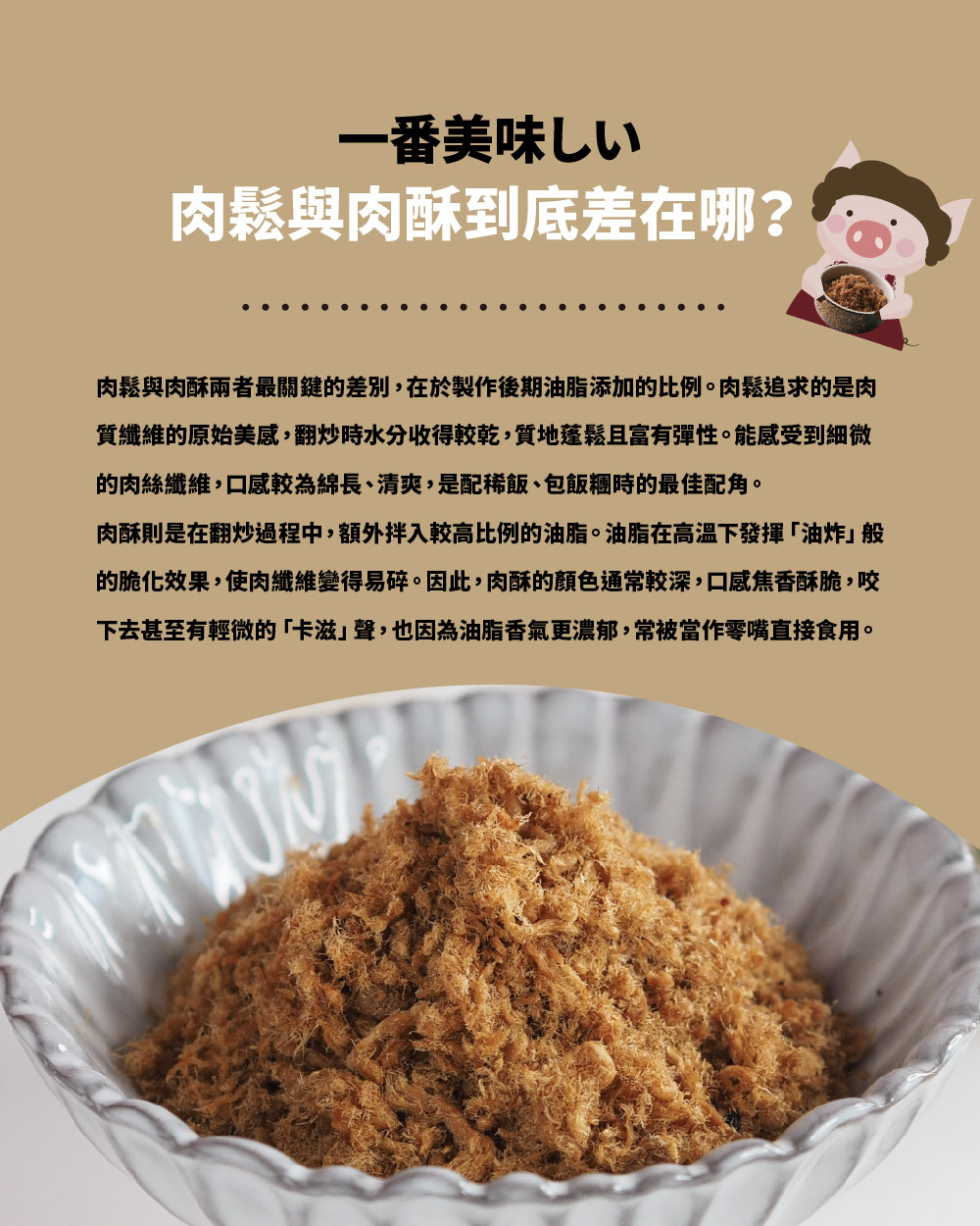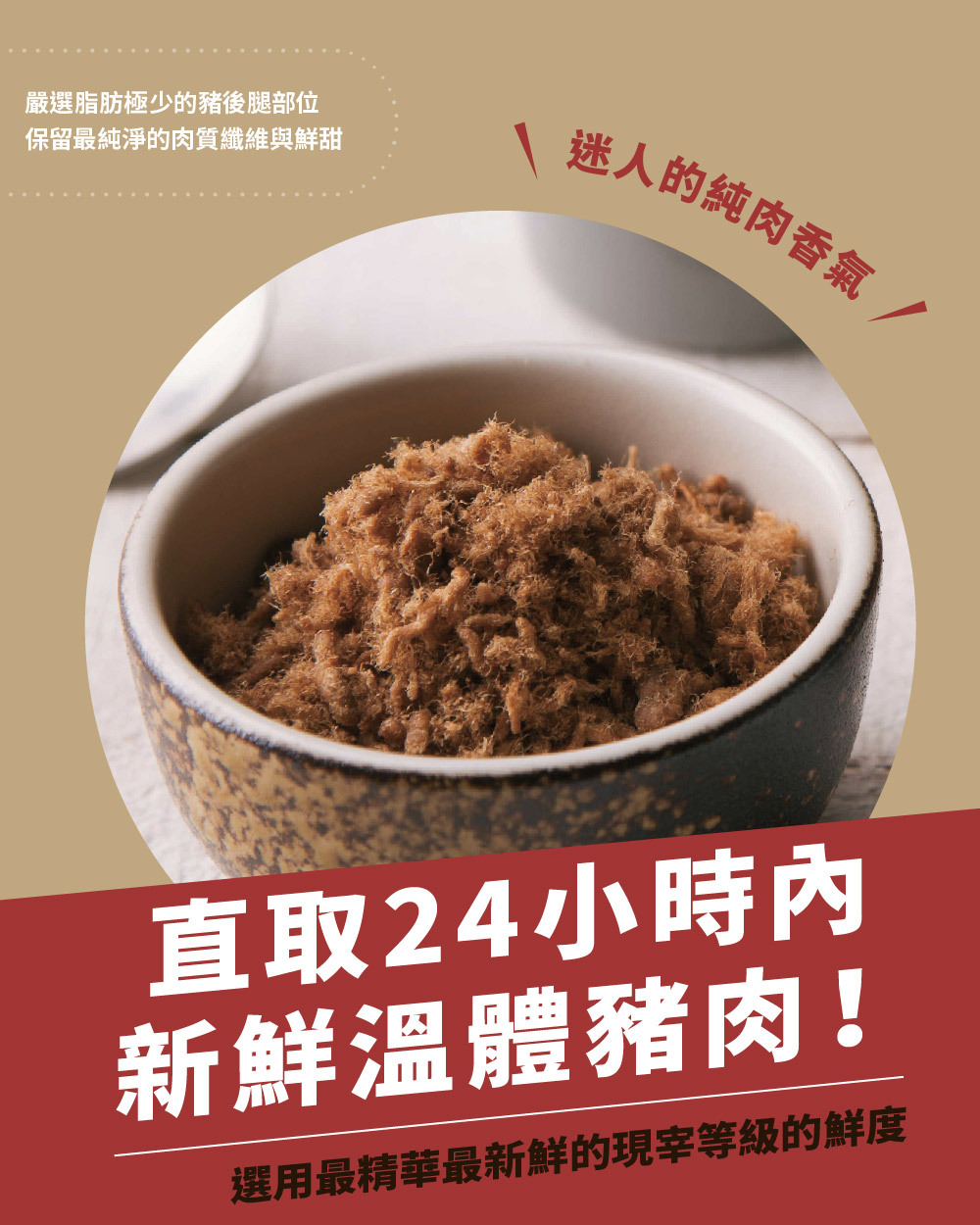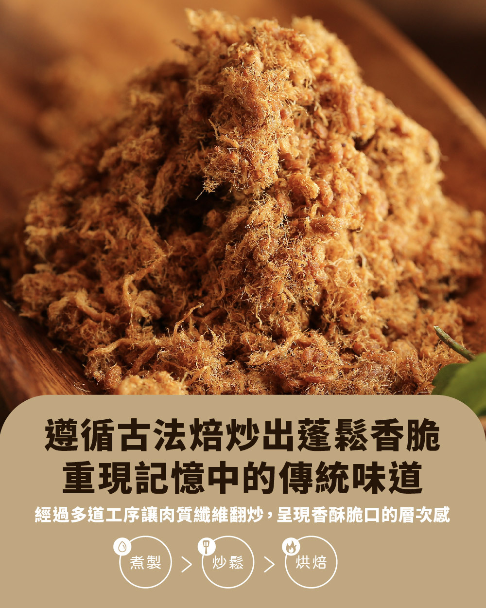 不添加味精、豆粉、人工添加物,保有肉絲完整纖維。特別採用屠宰24小時內的豬溫體肉,採集豬後腿中脂肪含量少的特定部位,做成後腿肉絲,先進加工技術與傳統焙炒方法兩者的運用下,使肉絲纖維呈現金黃色,口感蓬鬆酥脆,獨家特殊風味,絕對讓您愛不釋手。台畜原味肉酥為CAS認證的優良肉品,為潔淨標示最佳代表,讓您吃得安心、選購放心,是台灣特色伴手禮的最佳選擇。