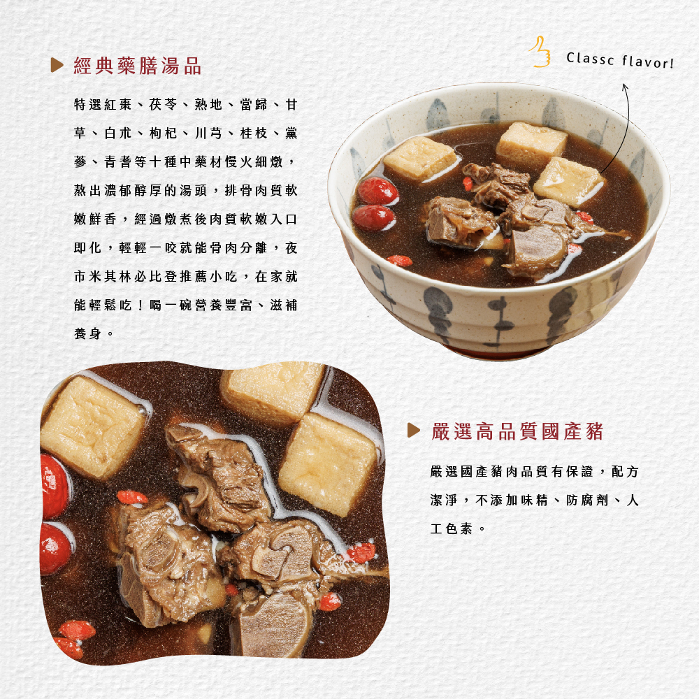 經典藥膳湯品以十種中藥材為基底,包括紅棗、茯苓、熟地、當歸等,經過精心熬煮製成。選用新鮮排骨,經過燉煮後肉質軟嫩入口即化,搭配豐富的湯頭,肉質鮮甜多汁,營養豐富,滋補養身。
