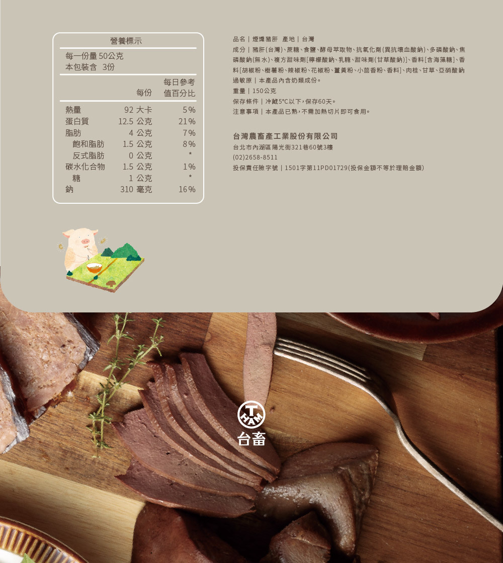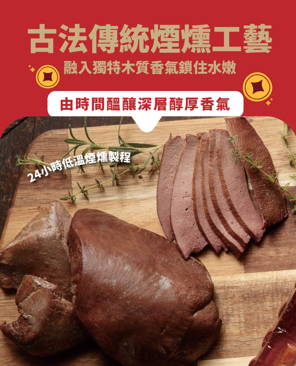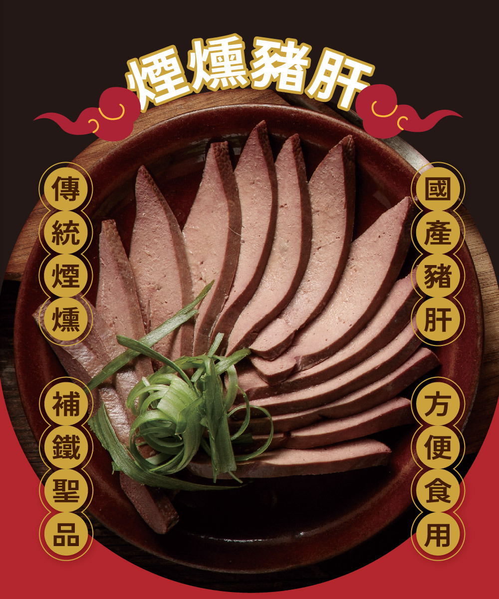台灣傳統美食,嚴選新鮮的健康豬肝,以天然香料醃漬入味,經過多道加工程序,煙燻香氣濃郁,口感細緻綿密,台畜獨家風味,無可取代,切片食用即是下酒菜的最佳選擇。搭配台畜醬肘子、歐式冷蹄、冰釀豬腳及煙燻豬肝,組成五福冷盤,作為宴請嘉賓、逢年團圓餐的開胃前菜,高級澎派,吃得滿足,面子十足。