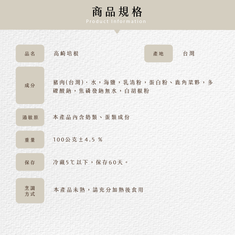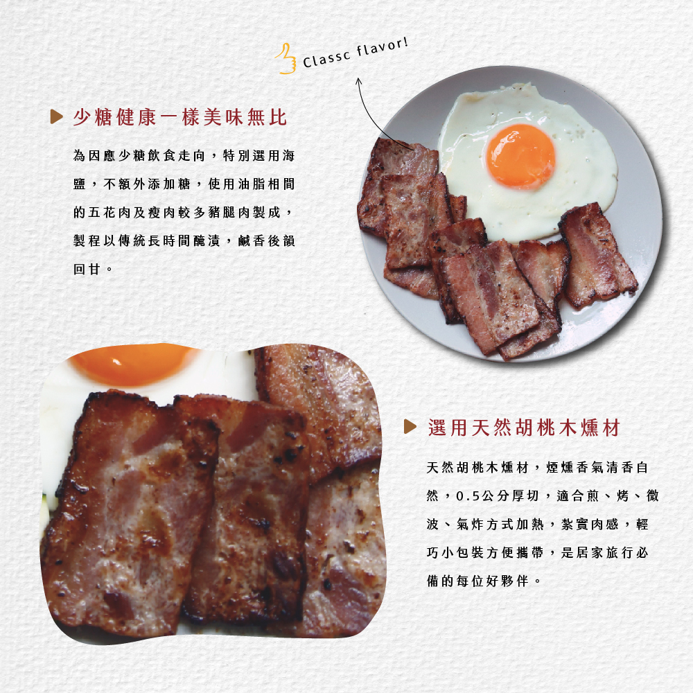 為因應少糖飲食走向,特別選用海鹽,不額外添加糖,使用油脂相間的五花肉及瘦肉較多豬腿肉製成,製程以傳統長時間醃漬,鹹香後韻回甘,天然胡桃木燻材,煙燻香氣清香自然,0.5公分厚切,適合煎、烤、微波、氣炸方式加熱,紮實肉感,輕巧小包裝,拆封即可完食。甚至拆封之後,冷食別有一番風味。