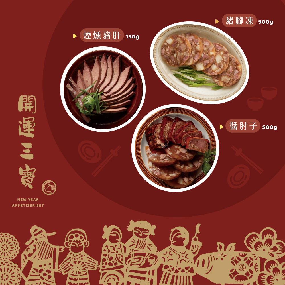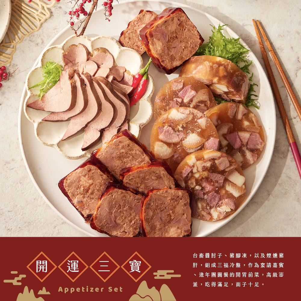 三道特色風味開胃菜冷盤「開運三寶」,買回家切片直接上桌,與各款年菜都百搭!